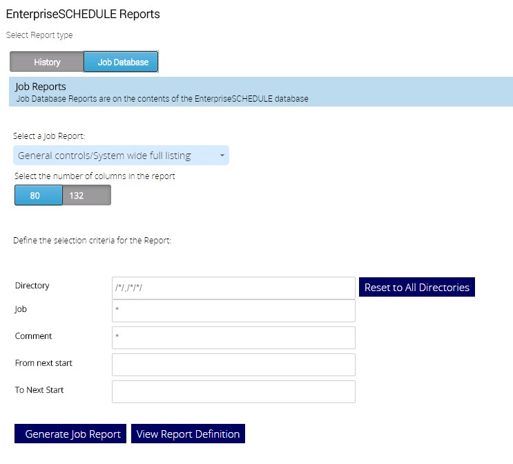 Reports can be created of History data for Jobs and the Contents of the Job Database. Reports can be 80 or 132 columns. A wide variety of Reports are provided based on several criteria.