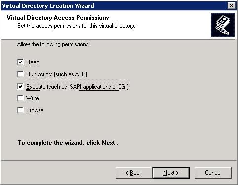 Set the Virtual Directory Access permissions to Read and Execute as shown: