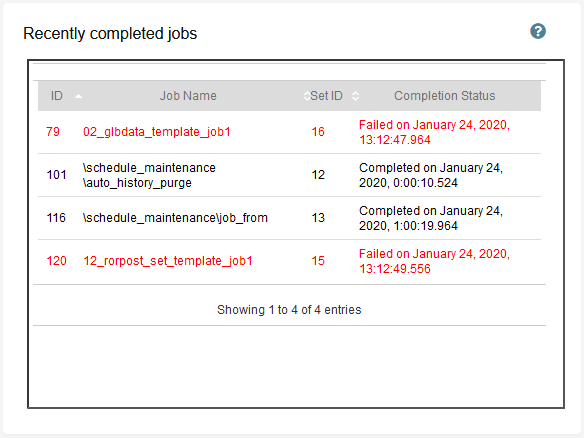 The Recently Completed Jobs window displays the most recently completed jobs with the most recent in red.