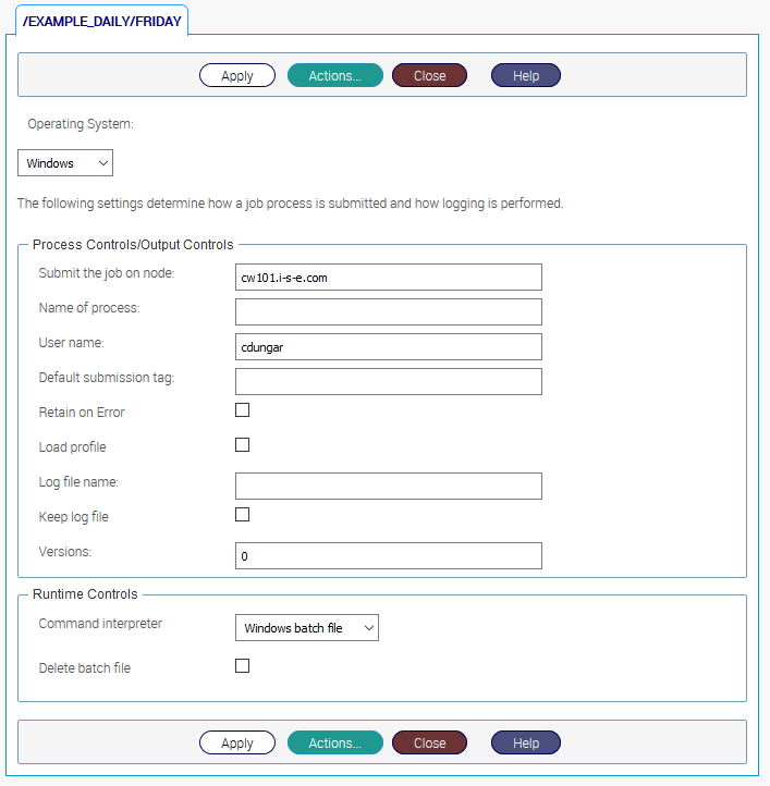 When jobs are submitted in Windows a process is created. You may determine the name of the process and the name of the log file which contains logging for the job run. The fields for Windows job submission are: